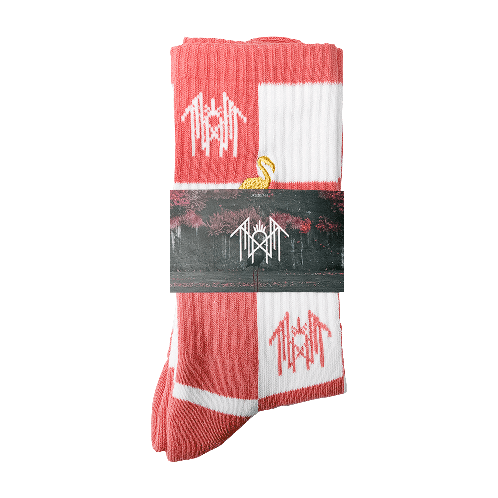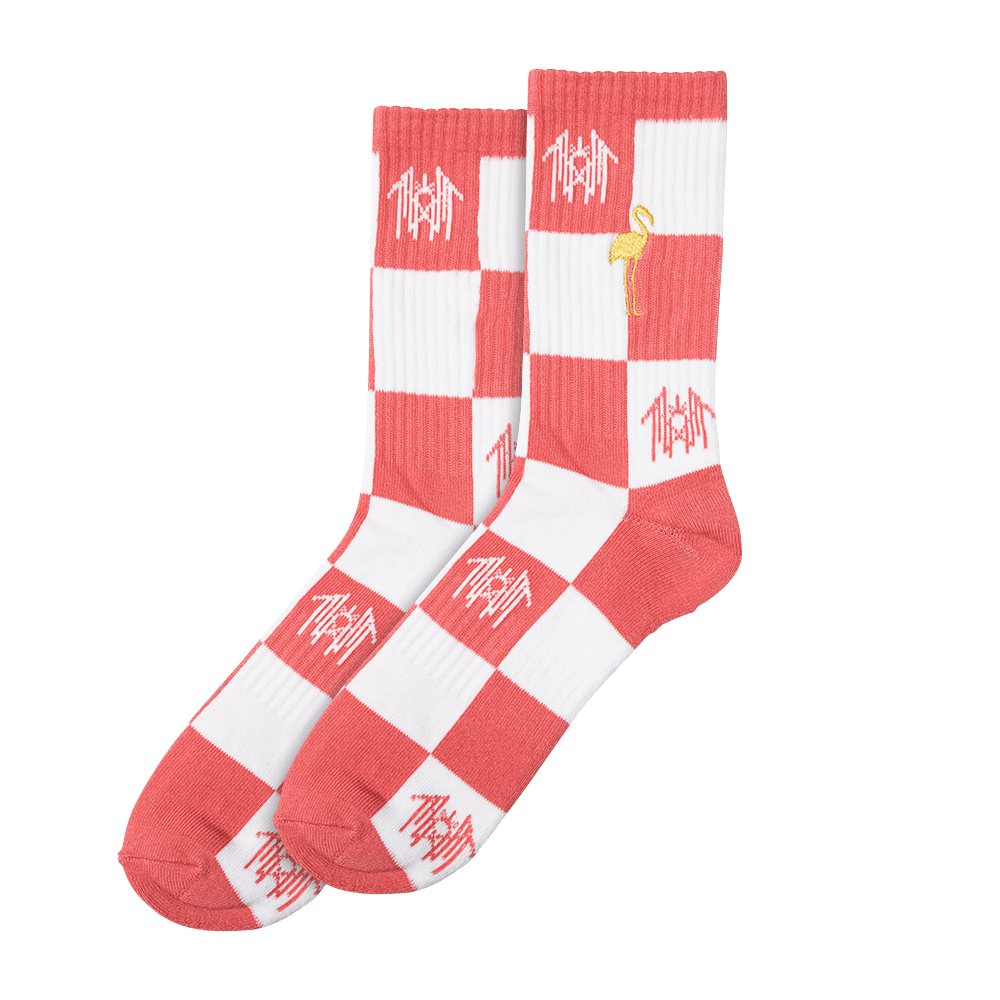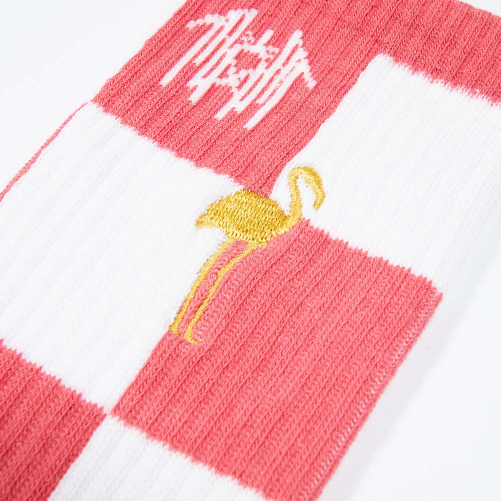 Custom pink & white checkerboard socks with embroidered gold flamingo.